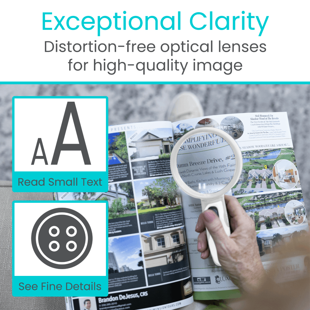 Perfecto para trabajos detallados, para niños, personas mayores y personas con baja visión, la lupa LED Vive incluye dos lentes incorporadas, 45x y 3x. Cada lente óptica produce una imagen nítida y clara que no se distorsiona. El juego de lupa ligera también tiene tres luces LED integradas que son fáciles de apagar y encender mientras están en uso.