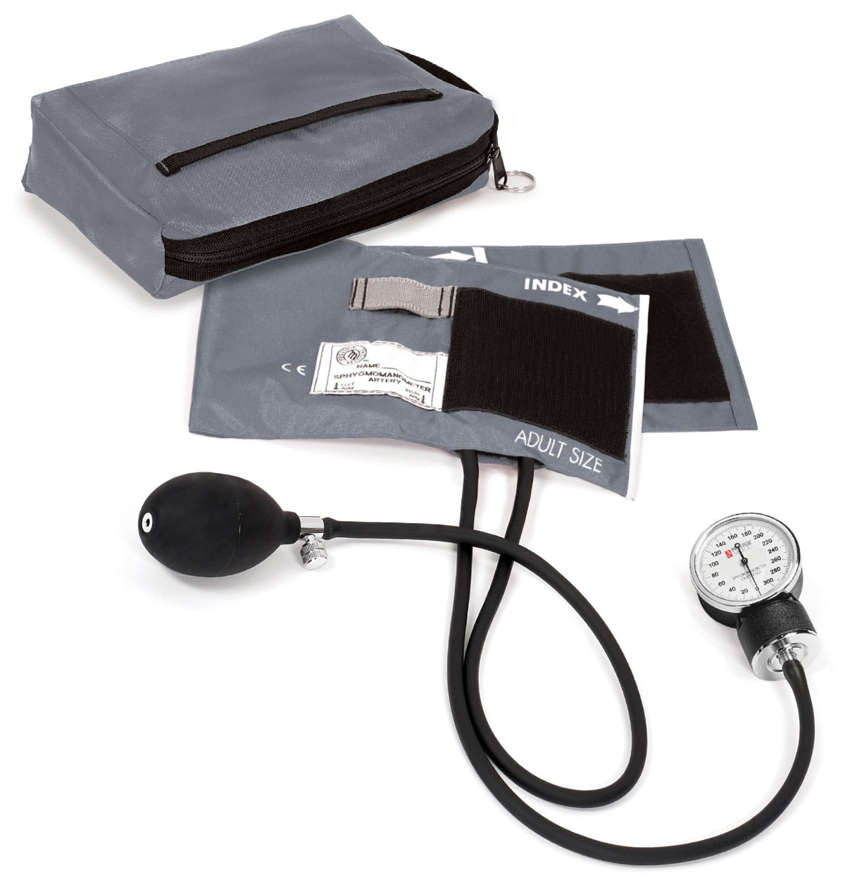 Características: Sin látex, brazalete de nailon, marcas de índice y rango, marca indicadora de arteria, etiqueta de identificación del propietario, soporte para medidor, pera de inflado estándar y válvula de liberación de aire, estuche de transporte de nailon de 6" x 9" a juego